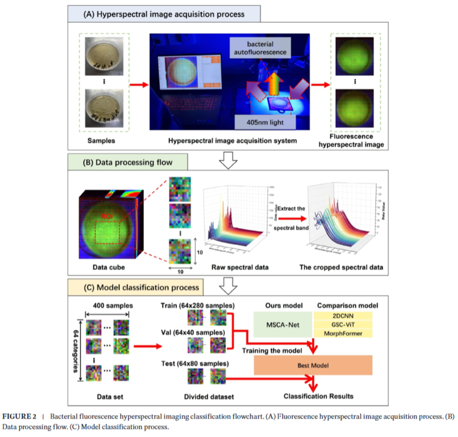 Ключевая роль в экспериментах отводилась камере CHNSpec FigSpec FS-22. Прибор работает в спектральном диапазоне 400–1000 нм и обладает высоким пространственным разрешением 1920 × 1920 пикселей, что позволило детально регистрировать сигналы аутофлуоресценции бактерий под воздействием лазера с длиной волны 405 нм. На основе полученных данных исследователи сформировали крупный флуоресцентный гиперспектральный датасет, включающий 25 600 образцов с разными видами бактерий, их концентрациями и временем роста. Для обработки сложных многомерных данных с малыми спектральными различиями между штаммами была разработана глубокая нейросетевая архитектура — «пространственно-спектральная многомасштабная сеть внимания». Эта модель эффективно выделяет зоны бактериальных колоний, подавляет фоновые помехи от питательной среды и извлекает из спектральной информации тонкие дискриминативные признаки.