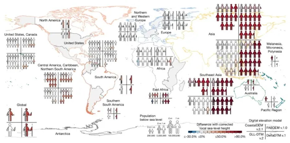 Эта диаграмма показывает разницу в численности населения, опускающейся ниже уровня моря после относительного повышения уровня моря на 1 м, между обычно предполагаемой высотой уровня моря и измеренной высотой уровня моря.