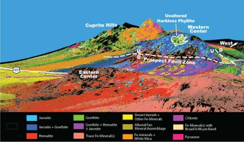 Области применения гиперспектрального дистанционного зондирования охватывают весь спектр дисциплин в наблюдениях Земли: от анализа воды, горных пород, почвы и растений до картирования экосистем. Гиперспектральные снимки используются для картирования минералогии на потенциальных участках добычи полезных ископаемых с целью понимания геологической истории. Можно даже определить температуру образования минералов. Примером является район добычи Кьюпрайт (Cuprite), состоящий из двух центров кислотно-сульфатных гидротермальных изменений, расположенных по обе стороны от автомагистрали US 95 в юго-западной Неваде.³ Кьюпрайт — одно из лучших в мире мест для полевых испытаний точности новых сенсоров и методов спектрального картирования благодаря разнообразию минералов изменений, отличным обнажениям пород, скудной растительности, сухому климату и легкому доступу.⁴ С помощью спектроскопических измерений ученые определили, что богатое минеральное разнообразие этого района сформировалось в ходе раздельного развития двух гидротермальных центров в Кьюпрайте. Это открытие имеет значение для геологоразведки и может быть использовано для дистанционного понимания структуры других гидротермальных систем как на Земле, так и на других планетах.
