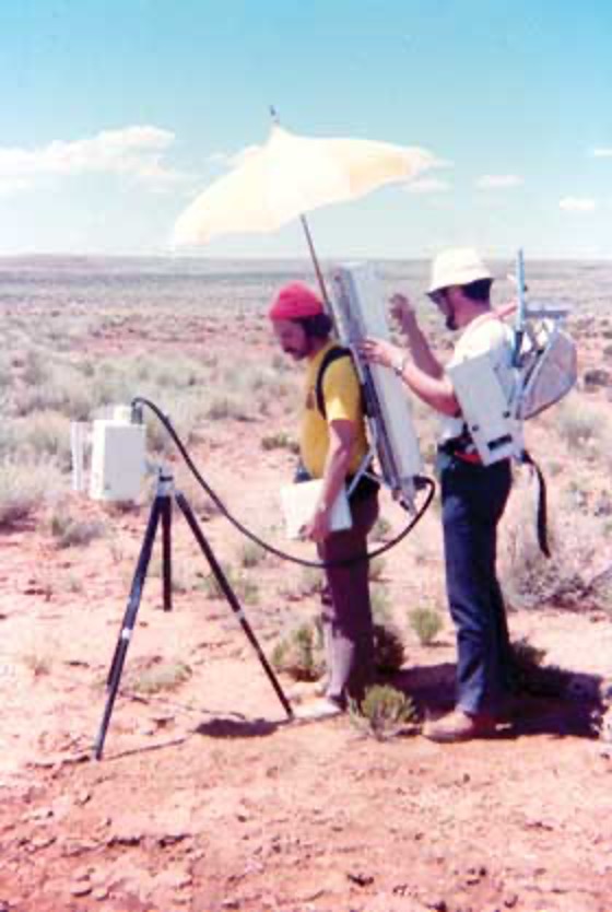 *Инструмент, с которого все началось: Майк Абрамс и автор, Алекс Гётц, используют первый по-настоящему портативный полевой спектрометр отражательной способности на плато Коконино в Аризоне. Прибор состоял из кругового переменного фильтра и PbS-детектора в оптической головке, а также электроники управления и регистрации в рюкзаке. Получение одного спектра занимало 30 секунд. Зонт был необходим для защиты прибора от солнца. Предоставлено ASD Inc.*