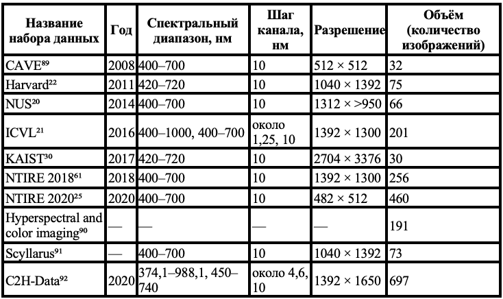 Также доступны и другие наборы данных, в том числе: Harvard [22]; Hyperspectral & Color Imaging [90]; Scyllarus hyperspectral dataset [91]; C2H [92].