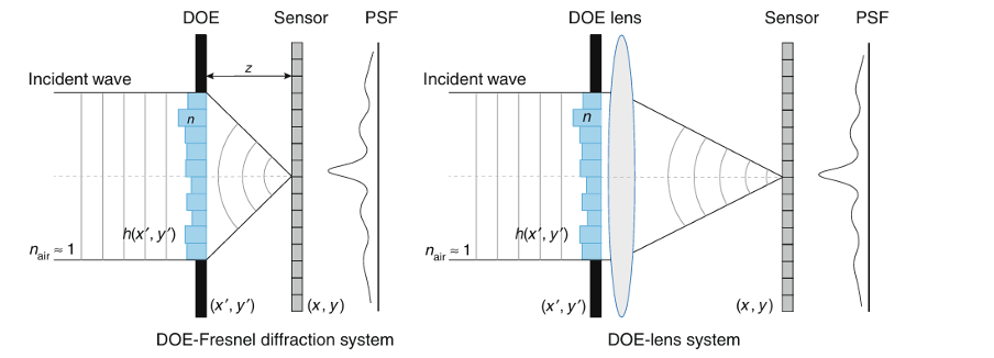 2. Кодирование по фазе (Phase-coded). Здесь для модуляции фазы входящего света для каждой длины волны используется ДОЭ (дифракционная оптическая элемент — DOE). Физически этот метод основан на распространении по Френелю, которое расширяет модуляцию фазы на итоговое изображение. Благодаря творческому подходу к проектированию ДОЭ достигается компактность системы и повышенная пропускная способность света.