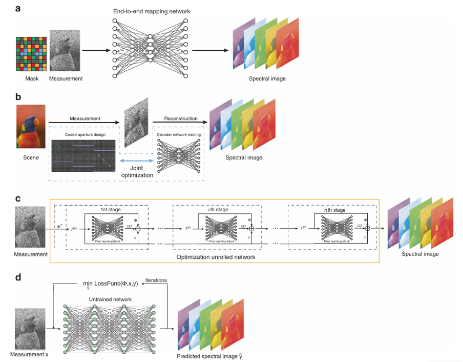 Чтобы снизить высокие вычислительные затраты, присущие вышеупомянутым методам, в качестве альтернативы было предложено применение алгоритмов глубокого обучения. Они позволяют изучать пространственно‑спектральные априорные данные и выполнять реконструкцию спектров.