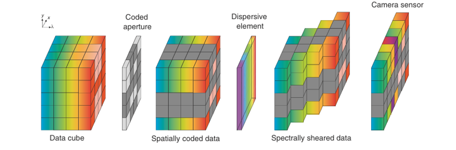Куб спектральных данных сначала проходит через кодированную апертуру, где осуществляется пространственное кодирование. Затем расположение спектральных компонент сдвигается (модулируется) с помощью дисперсионного элемента. В завершение детектор фиксирует итоговое изображение, содержащее закодированные пространственные и спектральные данные.