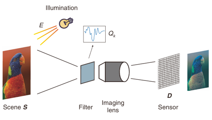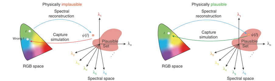 В работе [82] отклик RGB-фильтра Q был тщательно изучен. Они продемонстрировали, что реконструированный спектр должен удовлетворять свойству цветопередачи QTψ(I) = I, где ψ - это отображение RGB в спектр, а I - интенсивность пикселя RGB.