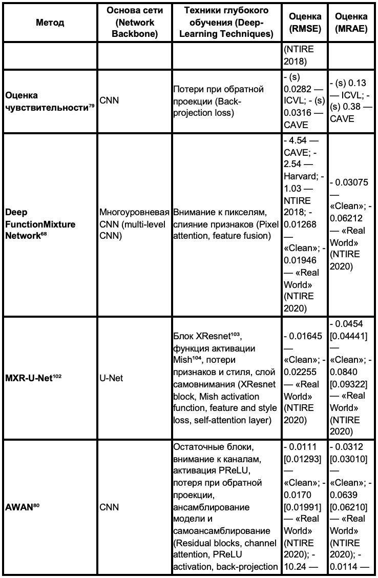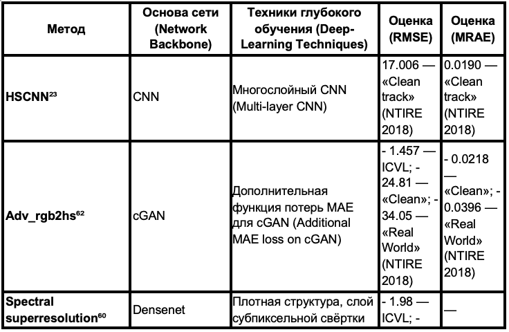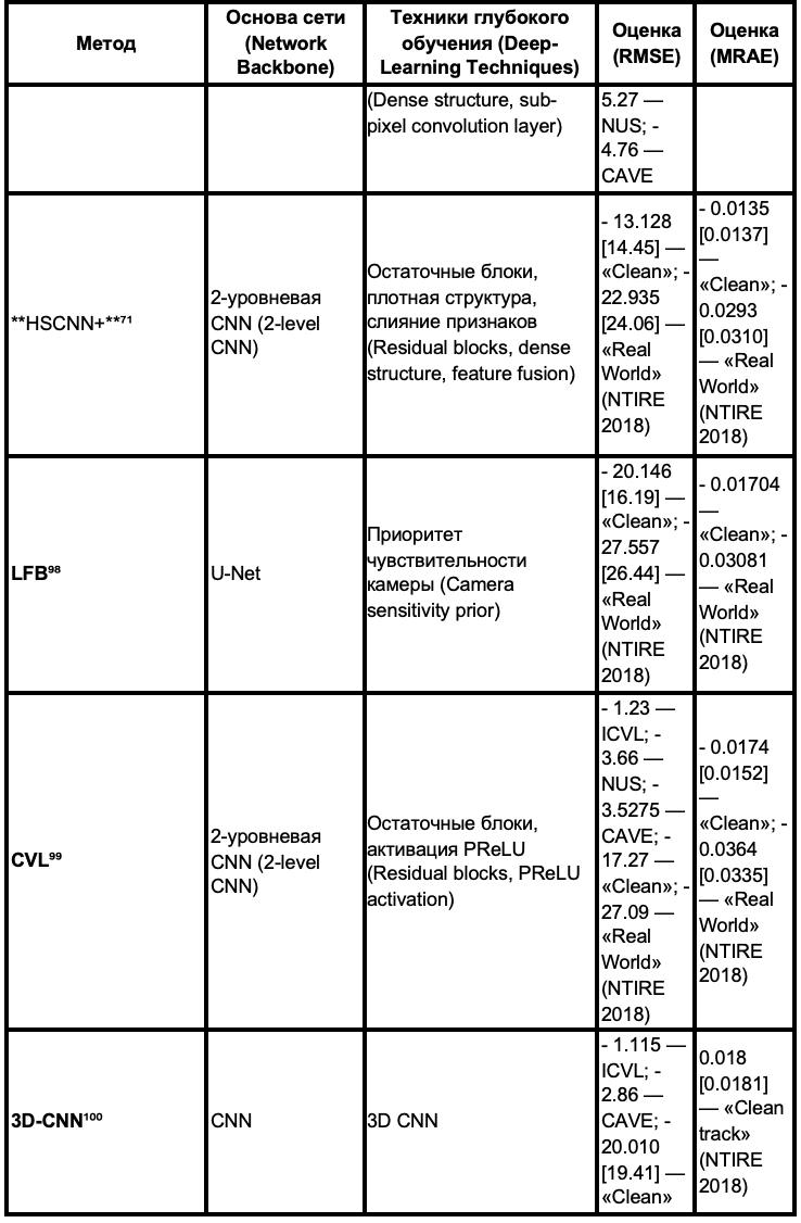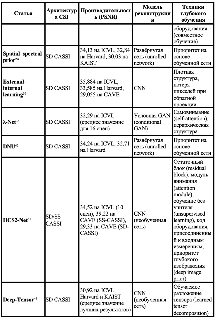 В последние годы во многих исследованиях в рамках систем спектральной съёмки использовались модели глубокого обучения (в частности, свёрточные нейронные сети — CNN). Такие решения продемонстрировали повышение скорости и качества реконструкции [15, 16, 23–25].