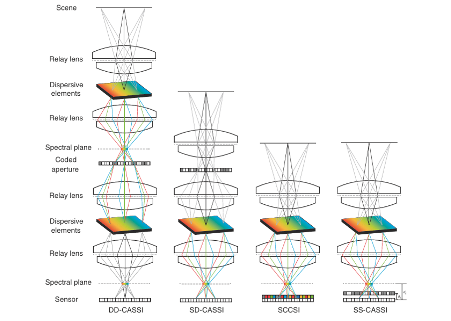 3. Снимковый цветной компрессионный спектральный визуализатор (SCCSI, snapshot colored compressive spectral imager) также использует кодированную апертуру и дисперсионный элемент, но размещает кодированную апертуру за дисперсионным элементом.