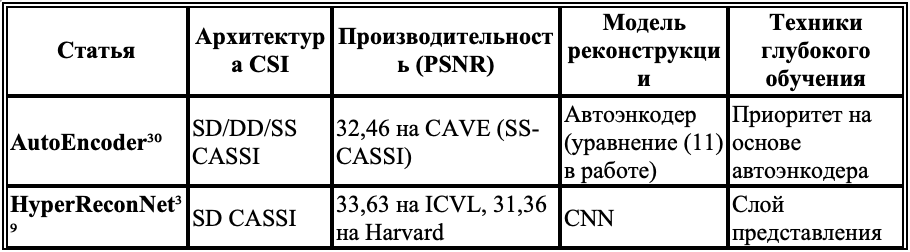 Некоторые методы компрессионной спектральной визуализации на основе глубокого обучения показали лучшие результаты при использовании архитектуры SS‑CASSI [30, 31].
