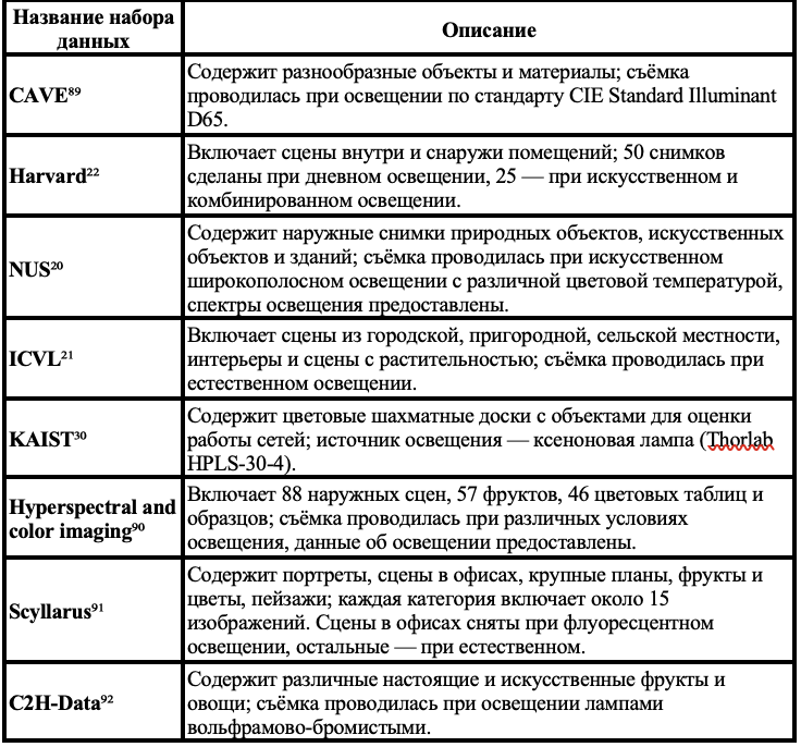 Наиболее часто для обучения и оценки в исследованиях по реконструкции спектра применяются следующие наборы данных: CAVE [89]; NUS [20]; ICVL [21];тKAIST [30].