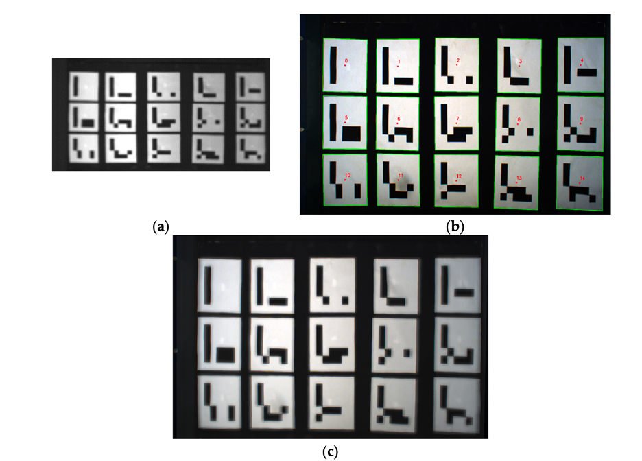 Рисунок 7. Часть (a) показывает ARUCO-маркеры, захваченные HSI-камерой; (b) те же маркеры, захваченные RGB-камерой; (c) результат регистрации после применения преобразования гомографии, с HSI, наложенным на RGB-изображение.