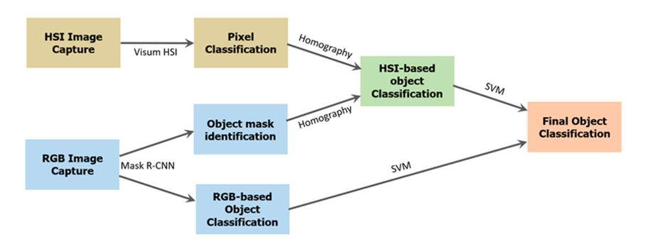 Интегрированное принятие решений. После регистрации HSI и RGB-изображений, обобщенной в предыдущих пунктах, классификация объектов отходов улучшается путем интеграции выходных данных RGB и HSI. Для этой цели необходимо использовать границы объектов, которые были определены модулем обработки RGB-изображений. Затем для каждого объекта отдельно рассматривается ряд признаков, извлеченных из выходных данных отдельных классификаторов RGB и HSI, которые объединяются с помощью метода опорных векторов (SVM) для выработки окончательного интегрированного решения о типе материала объектов.