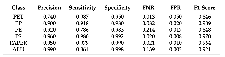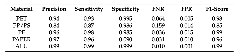 Что касается более низкого значения точности, наблюдаемого для ПЭТ (0.740), этот результат согласуется с неоднородностью бытовых изделий из ПЭТ. Комбинации с другими пластиками, такими как ПЭ, и/или наличие бумажных этикеток обычно присутствуют среди объектов отходов класса ПЭТ. Это может изменить спектральный сигнал поверхности и привести к спектральному перекрытию при попиксельной классификации. Как показано в Разделе 4.3, объединенная система частично компенсирует это поведение путем перекрестной проверки спектральных признаков, похожих на ПЭТ, с помощью RGB-масок экземпляров и признаков внешнего вида.