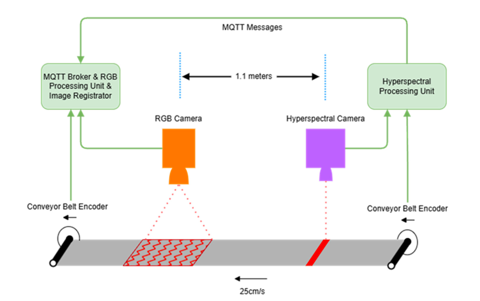 Лента работает автономно с заданной скоростью, транспортируя отходы, которые контролируются следующими двумя подсистемами. Камера HSI расположена первой и захватывает линии в нескольких узких полосах инфракрасного спектра, предоставляя спектральную информацию для каждого пикселя, соответствующего очень малой области реального мира. RGB-камера расположена после гиперспектральной камеры (по ходу потока отходов) и захватывает обычные 2D RGB-изображения. Вся информация, захваченная HSI и RGB-камерами, помечается специальными энкодерами, которые способны детально записывать положение ленты в данный момент. Примеры выходных данных компонентов категоризации отходов HSI и RGB проиллюстрированы на Рисунке 6.1.1 метра