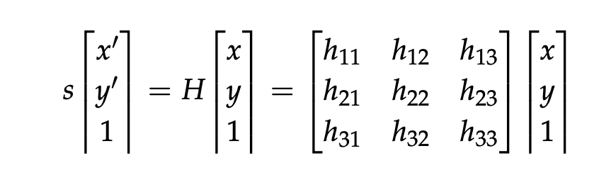 Таким образом, требуется вторая фаза выравнивания RGB-HSI, которая включает оценку геометрического преобразования, описывающего, как планарное HSI может быть отображено на RGB-изображение. Для решения этой проблемы была оценена гомография, которая кодирует проективное преобразование, связывающее соответствующие точки между двумя изображениями. Это представлено матрицей 3×3 H, удовлетворяющей следующему уравнению:
